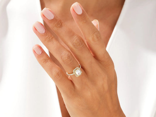1.0CT Emerald Cut Halo Moissanite Engagement Ring
