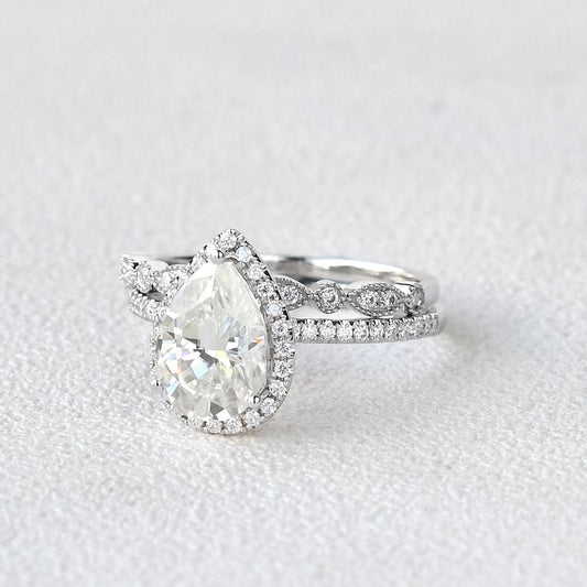 1.80CT Pear Cut Moissanite Halo Engagement Ring with Vintage Style Wedding Band