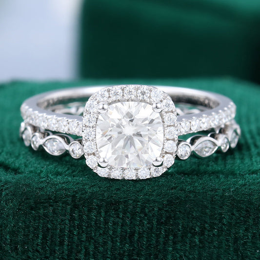 0.96 CT Cushion Moissanite Halo Bridal Ring Set