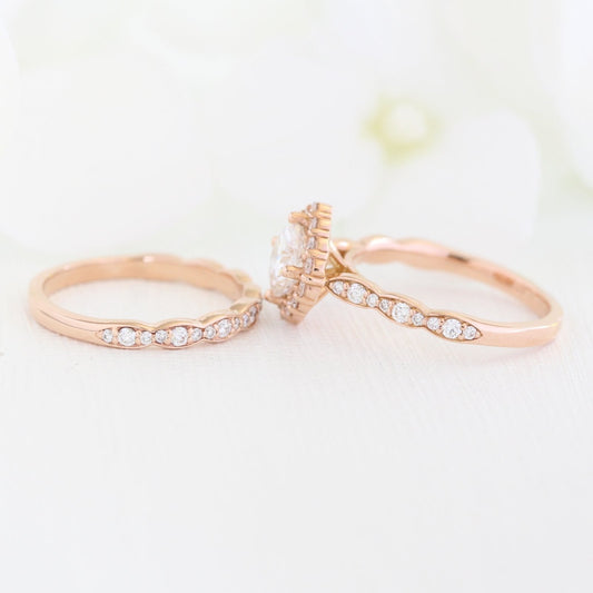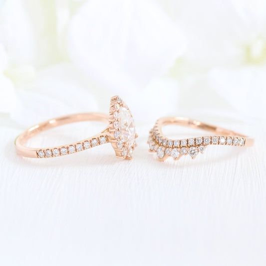 Pear cut moissanite with halo bridal band set 14k in rose gold