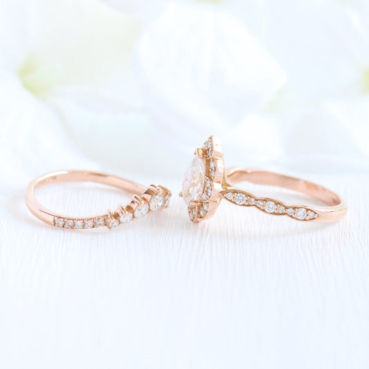 Pear cut moissanite with halo bridal band set 14k in rose gold