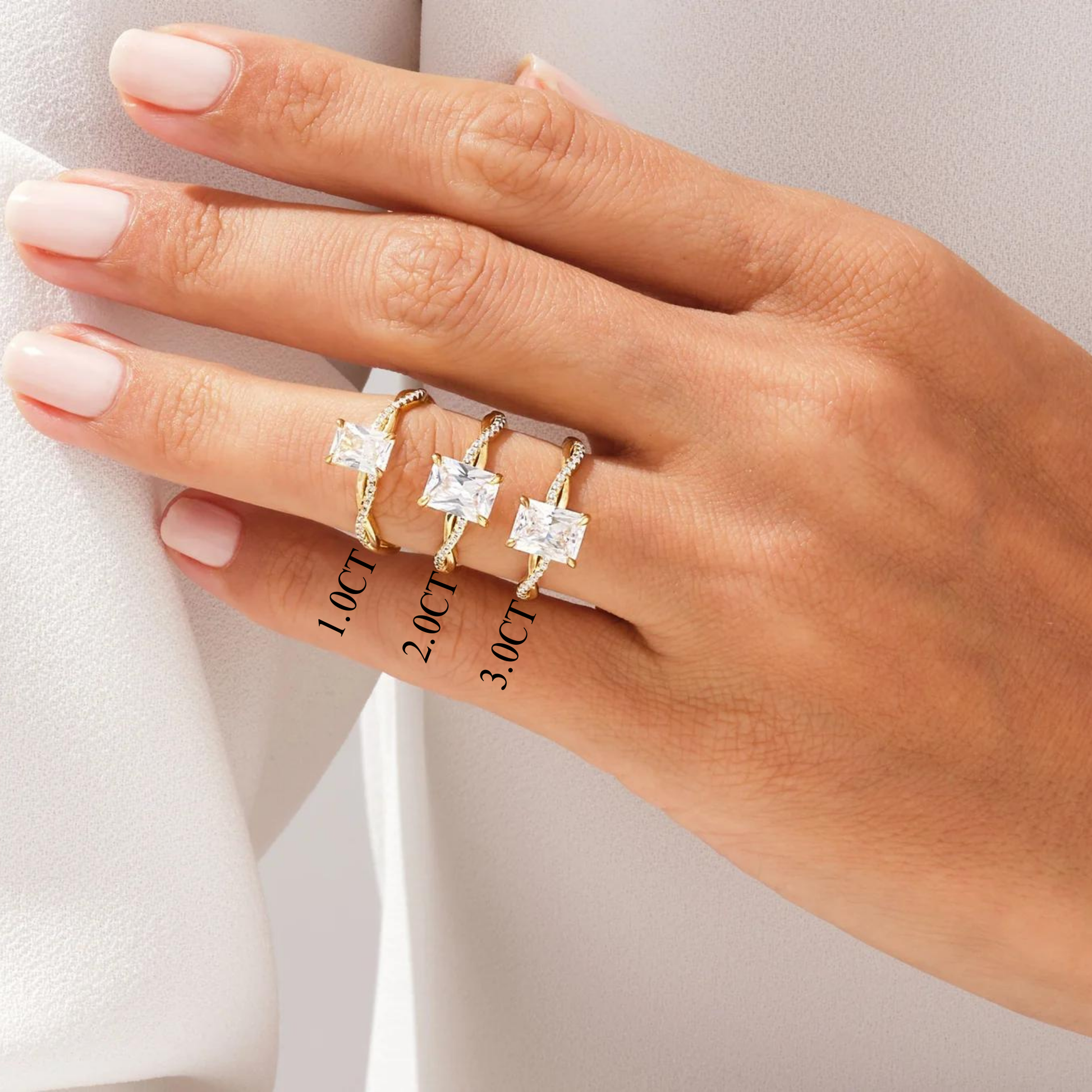 ✥This stunning 1.0CT Radiant Cut Moissanite Engagement Ring with a Twisted Pave Setting elegantly combines contemporary style with classic charm. The centerpiece features a dazzling radiant cut moissanite. known for its unique rectangular shape and brilliant facets that create a captivating sparkle. The intricately twisted band. adorned with shimmering pave-set stones. adds an artistic touch and enhances the overall brilliance of the ring. Ideal for those seeking a distinctive yet timeless engagement ring. this radiant cut moissanite offers a luxurious and affordable alternative to traditional diamonds. making it a perfect symbol of enduring love and commitment.