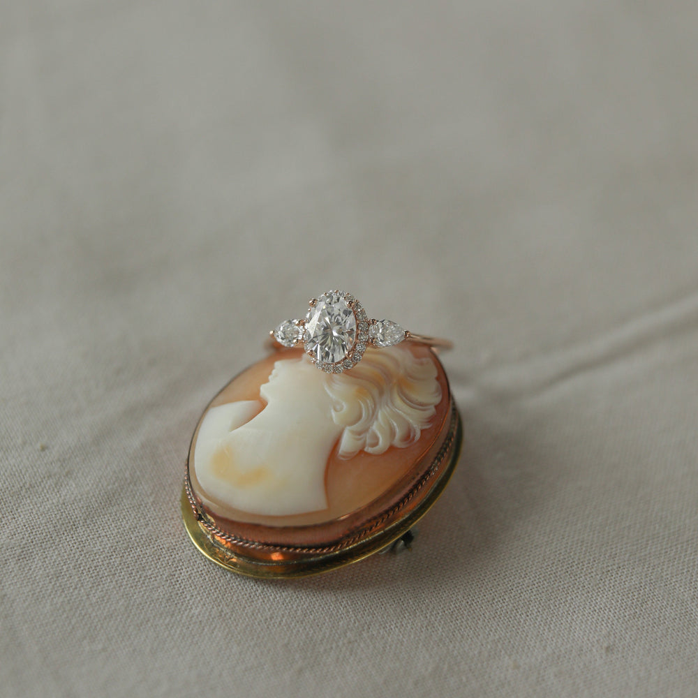 ✥ Presenting our 1.20ct Oval Cut Three Stone Moissanite Diamond Engagement Ring. a timeless symbol of love and commitment. The exquisite oval-cut moissanite center stone is flanked by side stones: round & pear Diamonds. adding extra sparkle and elegance to the design. Crafted with precision and attention to detail. this ring captures the essence of everlasting love and is sure to make your proposal unforgettable.
