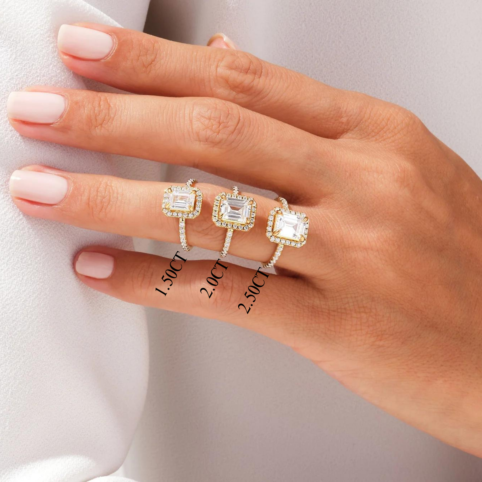 ✥ This exquisite 1.50CT Emerald Cut Moissanite Engagement Ring with a Halo Pave Setting is a stunning blend of elegance and modern sophistication. The centerpiece features a beautifully crafted emerald cut moissanite. renowned for its distinctive rectangular shape and captivating clarity. which creates a mesmerizing play of light. Encircled by a halo of sparkling pave-set stones. this design enhances the brilliance of the center stone. making it a captivating focal point. The pave setting along the band adds an extra layer of shimmer and luxury. elevating the overall aesthetic of the ring. Perfect for those seeking a timeless yet contemporary engagement ring. this emerald cut moissanite offers a radiant and affordable alternative to traditional diamonds. symbolizing enduring love and commitment.