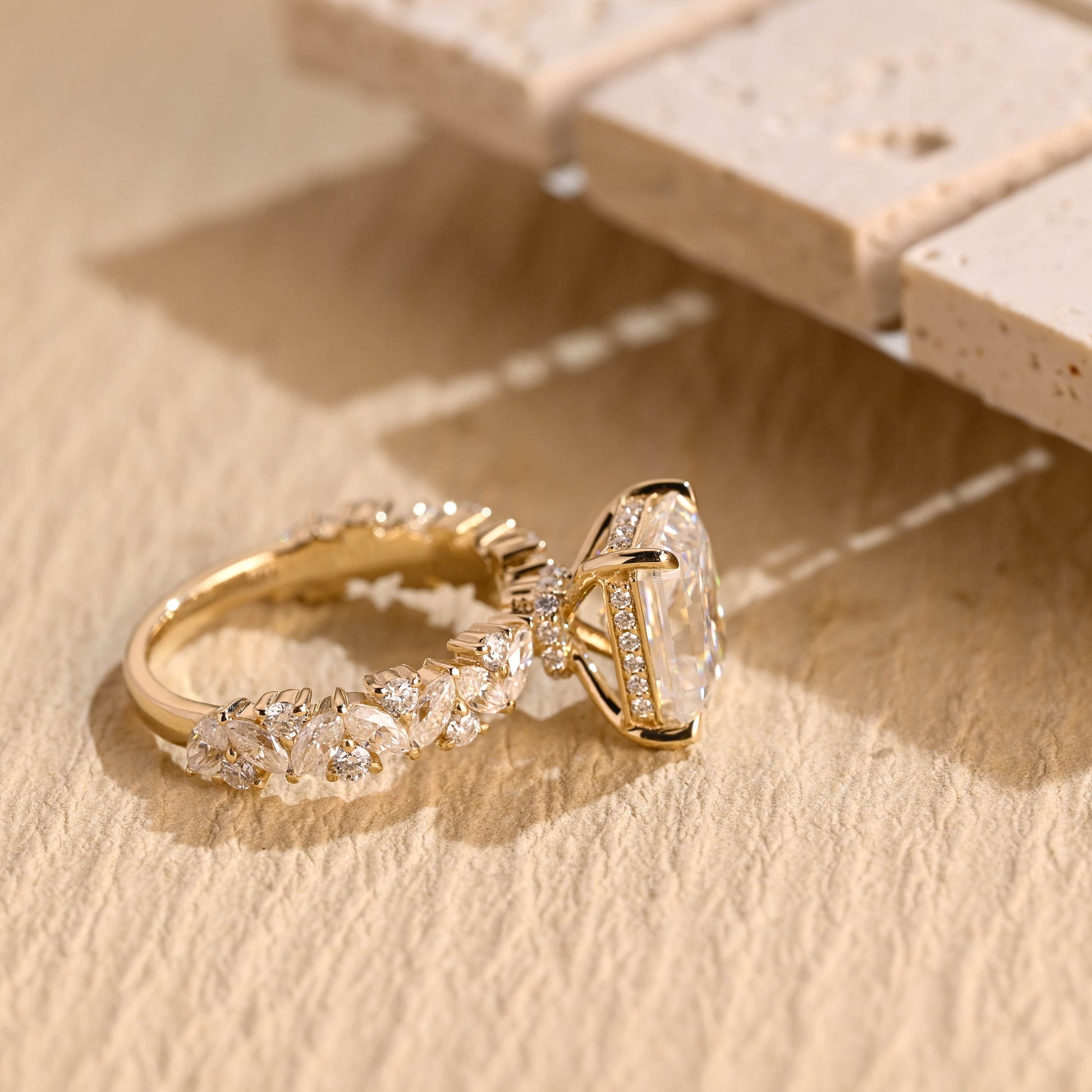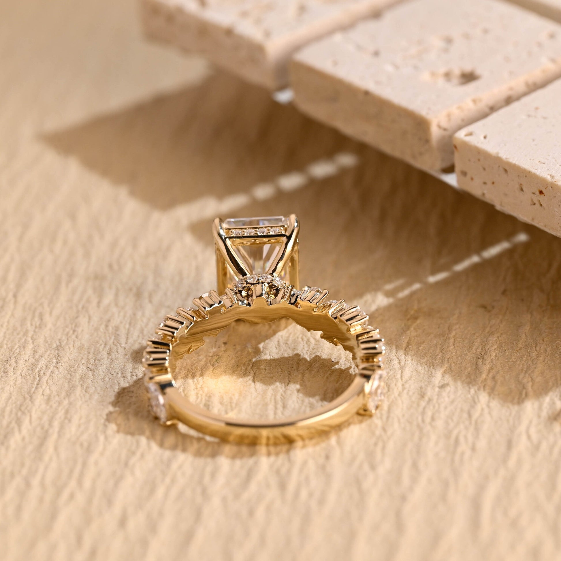 ✥The 1.50 CT Radiant Cut Hidden Halo Cluster Moissanite Engagement Ring features a stunning 1.50 CT radiant-cut moissanite at its center. surrounded by a hidden halo of smaller diamonds or moissanite. The cluster of stones beneath the center stone adds an extra layer of sparkle and brilliance. creating a captivating effect. The hidden halo is cleverly tucked beneath the main stone. giving it a unique and elegant touch. This design combines classic beauty with a modern twist. making it a perfect symbol of love and commitment.