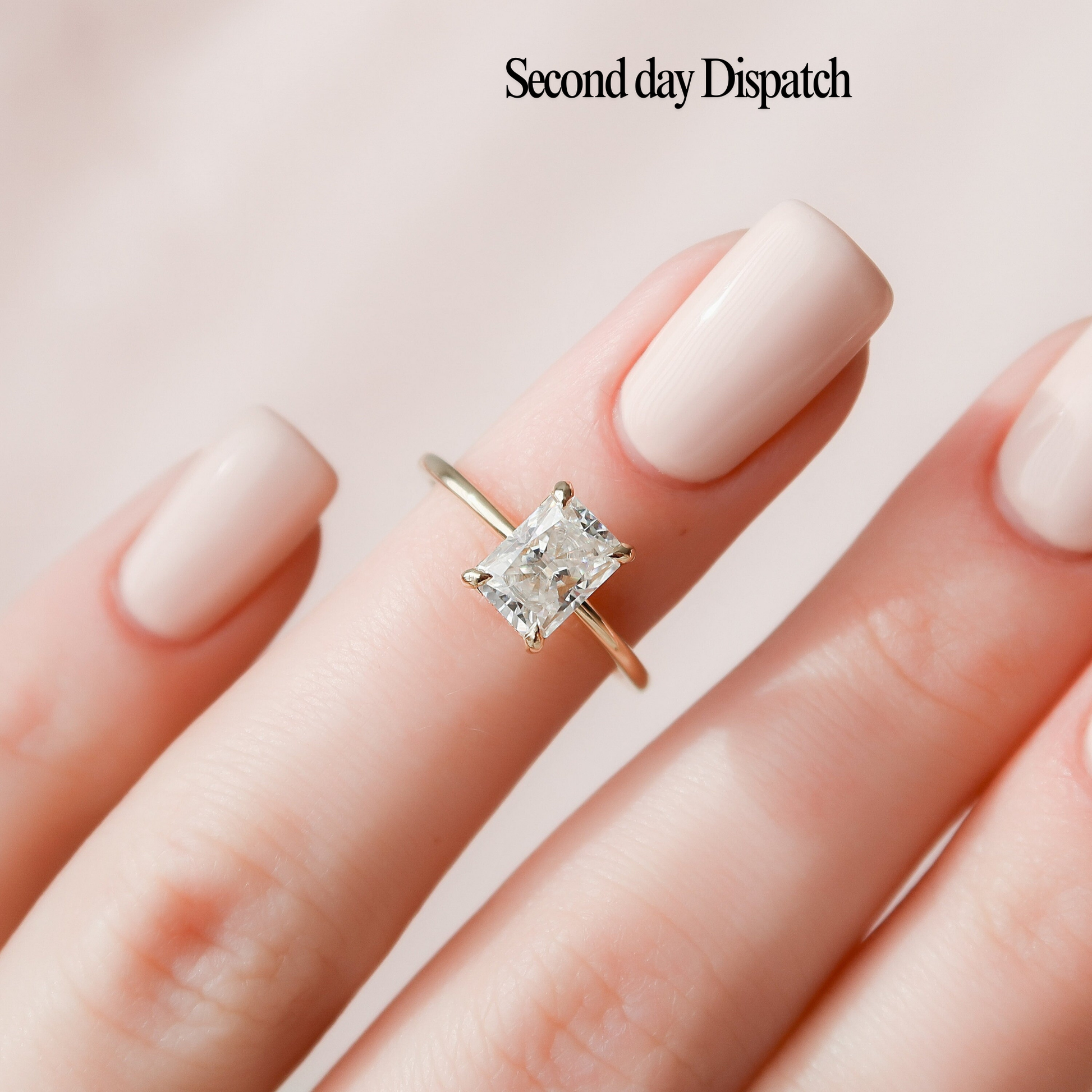 ✧ This elegant engagement ring features a 1.50CT radiant cut moissanite. exuding brilliance and sophistication. A hidden halo of smaller stones enhances the sparkle. giving the ring a unique and modern touch. Set in 14K yellow gold. it offers a classic and timeless look that complements the radiant centerpiece. Available in size 6.50 US. this ring is ready to ship with next-day dispatch for a quick and seamless delivery.