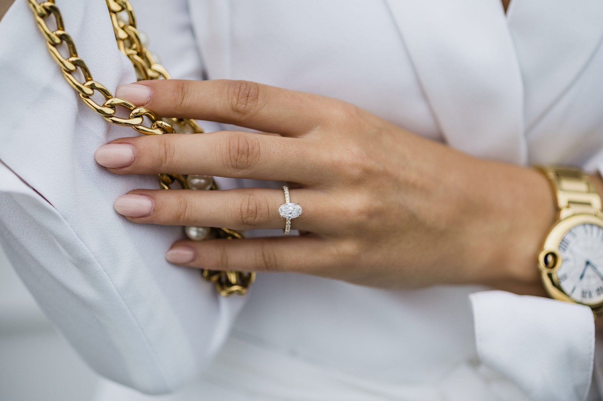 ✥ Indulge in the allure of everlasting love with our 1.85CT Oval Cut Hidden Halo Moissanite Diamond Ring. a captivating symbol of timeless elegance and romantic mystery. The stunning 1.85-carat oval-cut moissanite takes center stage. delicately encircled by a concealed halo of glistening diamonds. creating an ethereal dance of light. Meticulously crafted. this engagement ring seamlessly blends classic sophistication with a touch of intrigue. symbolizing the depth and uniqueness of your commitment. Ethically sourced moissanite ensures both breathtaking beauty and responsible luxury. This ring is more than a piece of jewelry; it's a radiant reflection of your shared journey. promising a future as brilliant and filled with delightful surprises as the hidden halo that surrounds it. Make your proposal truly unforgettable with this extraordinary ring. an everlasting testament to the sparkle of your love story.
