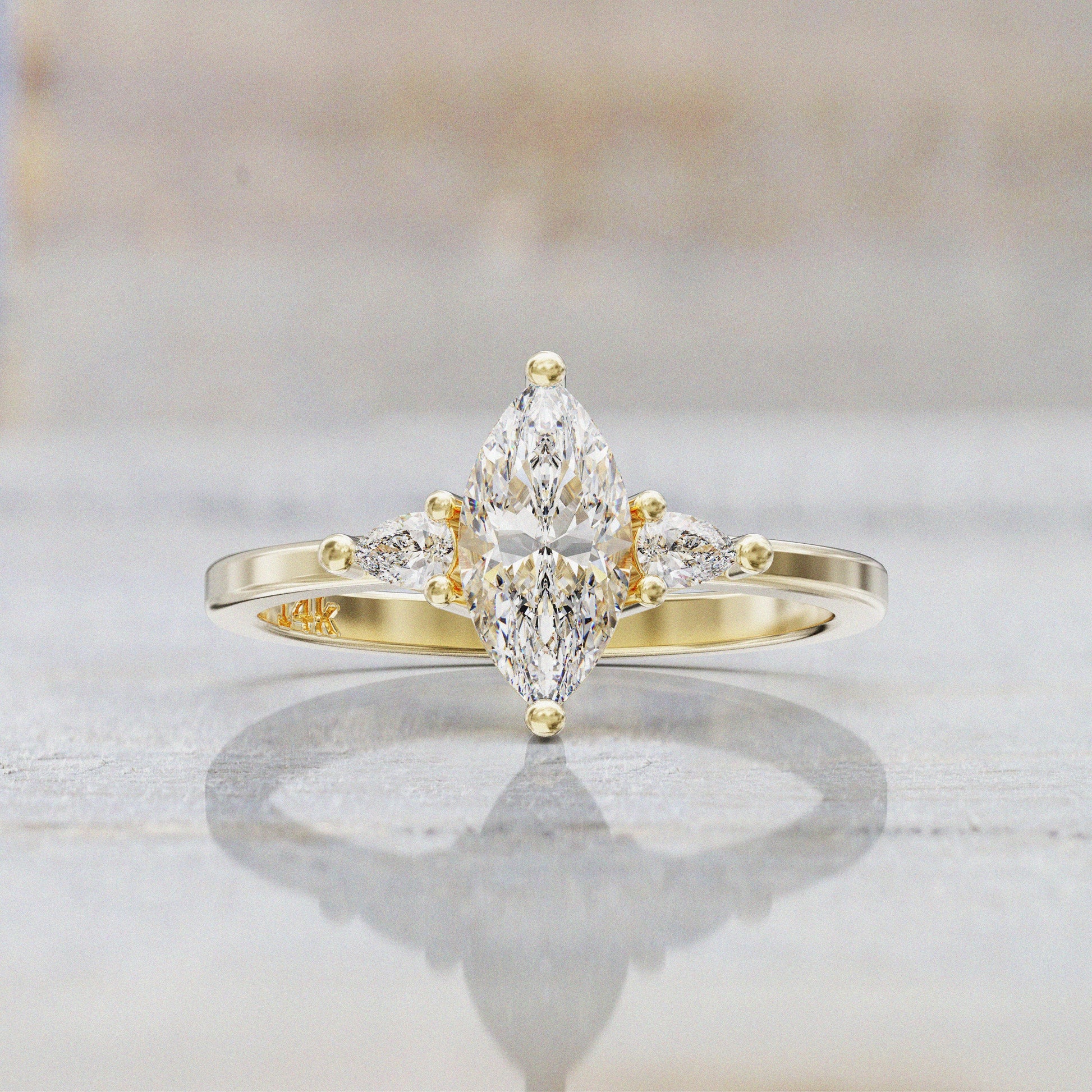 ✥ Celebrate your unique love with the 0.7 CT Marquise Cut Moissanite Three Stone Engagement Ring. Featuring a stunning marquise-cut moissanite as the central gem. flanked by two additional marquise-cut stones. this design creates a striking and elegant look. The marquise cuts' elongated shape enhances the ring's brilliance and drama. while the trio of stones symbolizes a past. present. and future together. Set in a sleek band. this engagement ring beautifully blends classic sophistication with modern flair. making it a perfect symbol of a love that is both radiant and enduring.