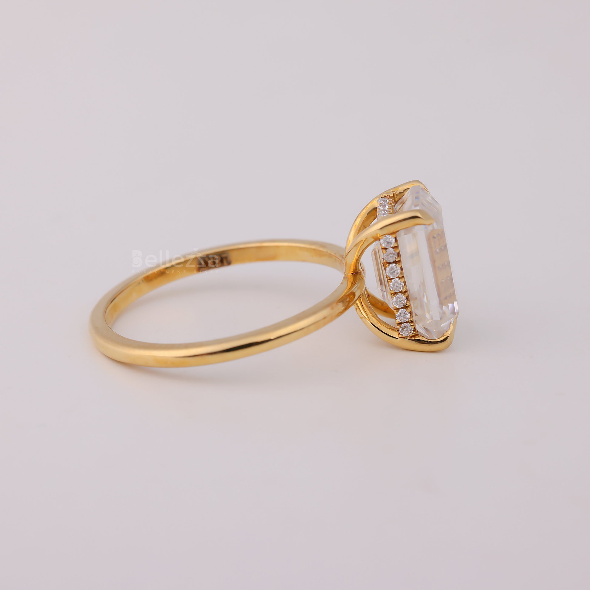 ✥ This stunning engagement ring features a 2.25CT emerald cut moissanite. renowned for its elegant lines and captivating brilliance. The hidden halo of smaller stones subtly enhances the center stone. adding an exquisite touch of sparkle to the design. Crafted in luxurious 18K yellow gold. this ring offers a warm. timeless appeal. Available in size 5.00 US. it is ready to ship with next-day dispatch. ensuring a swift and delightful delivery.