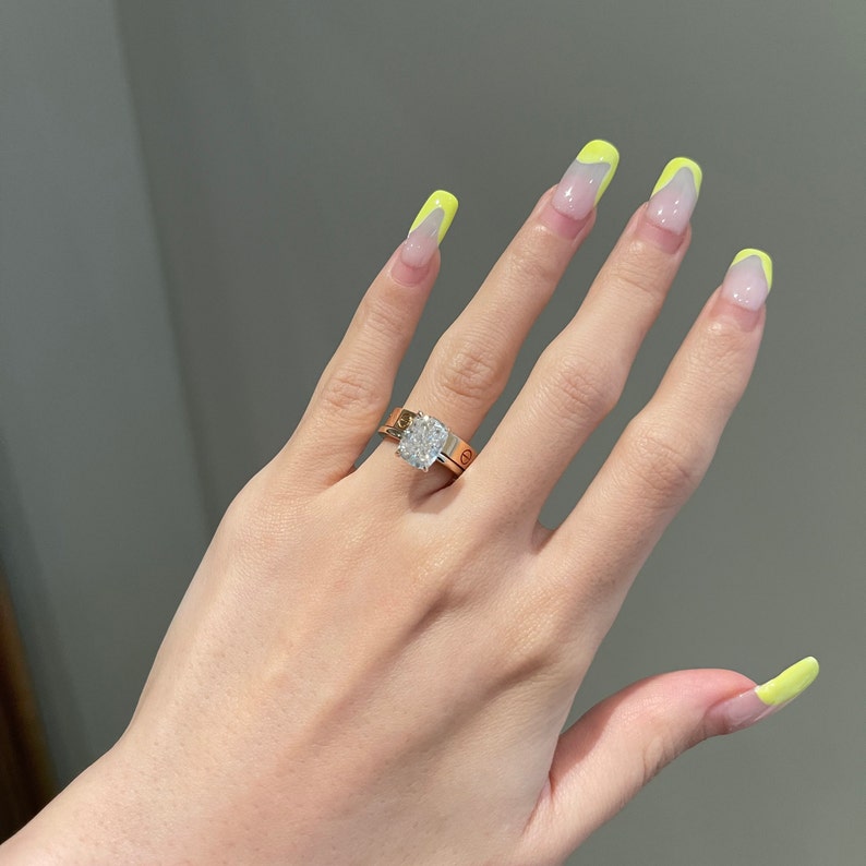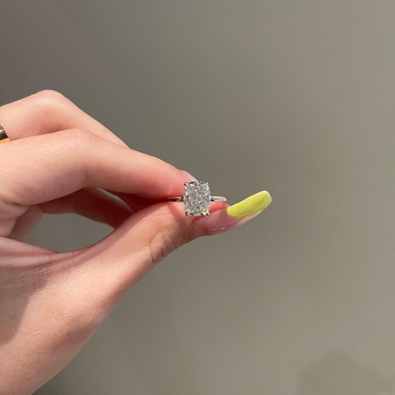✥ Experience the timeless elegance of our 3.0CT Elongated Cushion Cut Diamond Hidden Halo Moissanite Engagement Ring. At its heart lies a magnificent cushion-cut moissanite. embraced by a delicate hidden halo adorned with round diamonds. enhancing its brilliance and charm. The intricately crafted band features additional round diamonds. accentuating the center stone's allure. This ring symbolizes eternal love and commitment. capturing the essence of your unique journey together. Crafted with meticulous attention to detail. it's a testament to your enduring bond and a cherished symbol of your future together.