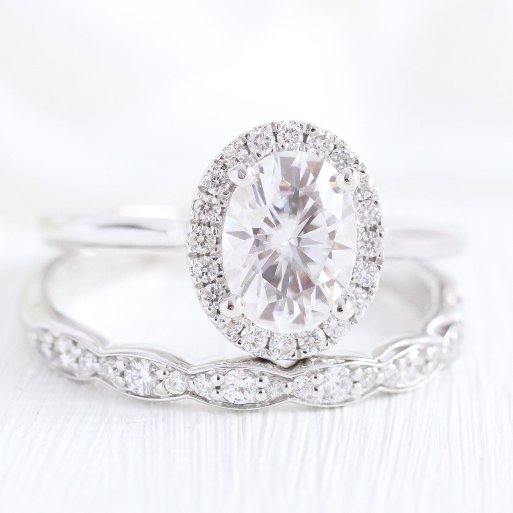 Oval Cut Halo Moissanite Ring With Scalloped Diamond Band Ring