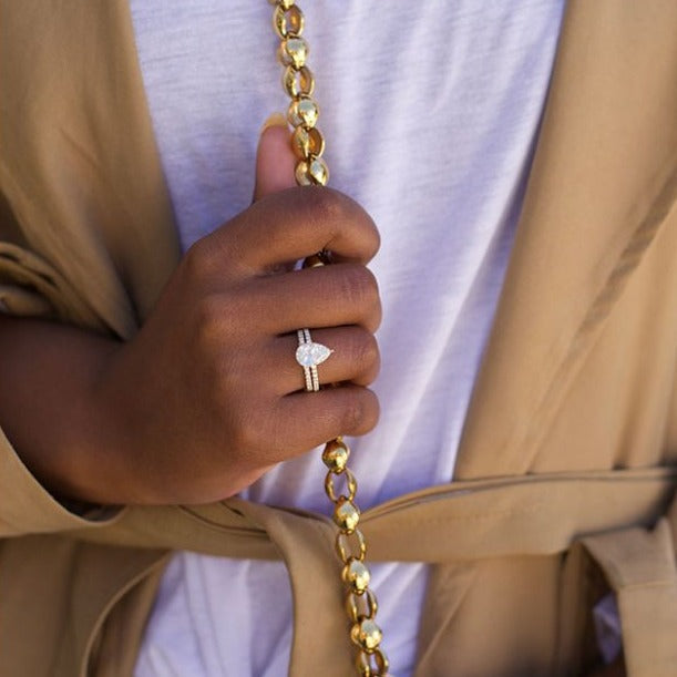 ✥ Indulge in the timeless allure of our 2.0ct Pear Cut Hidden Halo Moissanite Diamond Ring. a mesmerizing embodiment of love and sophistication. The pear-cut centerpiece. boasting 2.0 carats of exquisite moissanite. takes center stage with its elegant teardrop shape. reflecting light in a dance of brilliance. The hidden halo surrounding the pear-cut stone adds a touch of mystery and enchantment. creating an ethereal glow that enhances the ring's overall allure. The intricately designed band features additional petite diamonds. contributing to the ring's undeniable sparkle and grace. Set in a choice of high-quality metals. this engagement ring is a perfect blend of modern aesthetics and classic charm. symbolizing a love that is both enduring and extraordinary. With its unique design and timeless elegance. this ring is an impeccable choice to declare your commitment and celebrate the beauty of a love that knows no bounds. Embark on a journey of eternal love with the 2.0ct Pear Cut Hidden Halo Moissanite Diamond Ring.