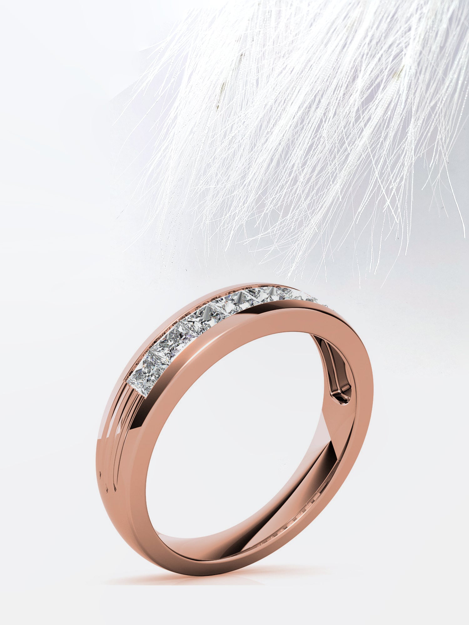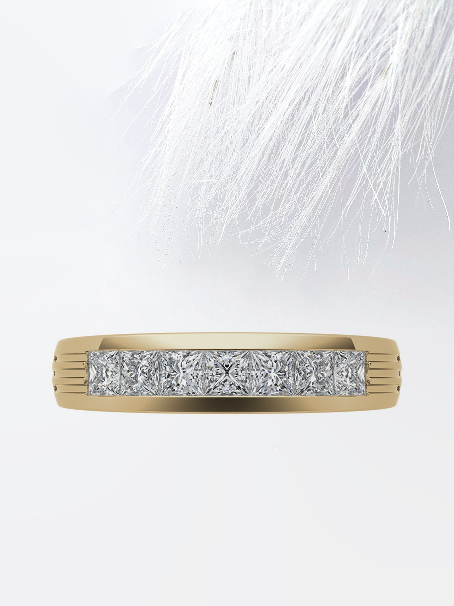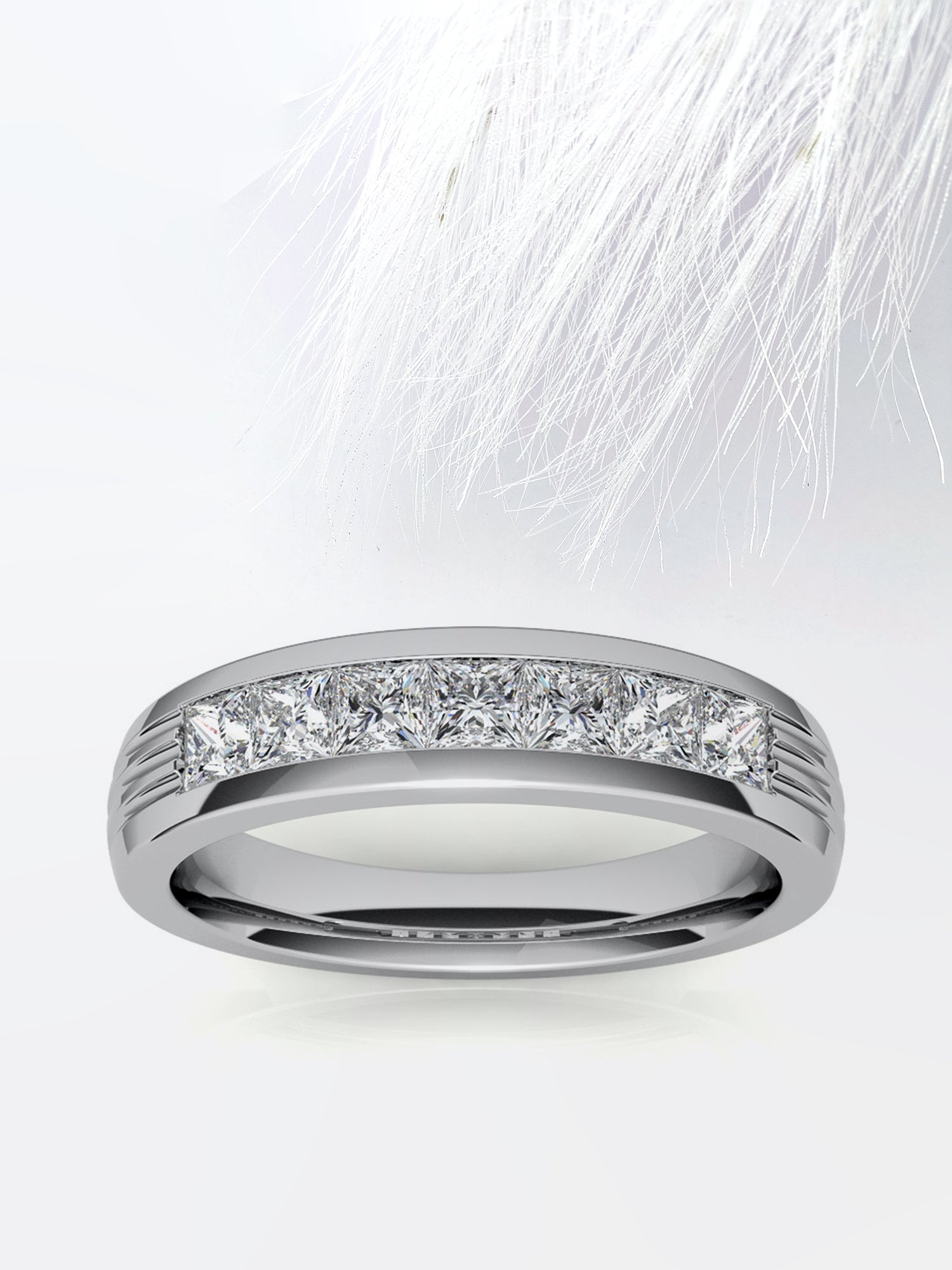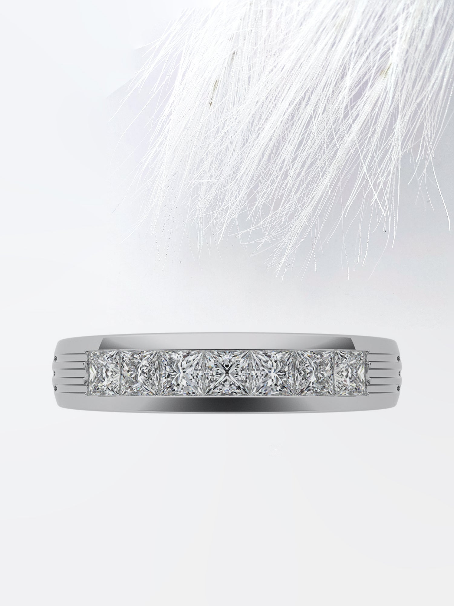✥ Introducing our Princess Cut Channel Moissanite Men's Diamond Wedding Band. a stunning symbol of eternal love and commitment designed for her. Meticulously crafted. this exquisite wedding band features dazzling princess-cut Moissanite stones elegantly set within a classic channel setting. Renowned for their exceptional brilliance and durability. the Moissanite stones radiate with captivating sparkle. adding a touch of glamour to any ensemble. Whether worn as a symbol of devotion or as a fashionable statement piece. this wedding band exudes timeless charm and elegance. making it the perfect choice for commemorating the bond between two hearts. Elevate your special day with this extraordinary piece that captures the essence of romance and enduring beauty.