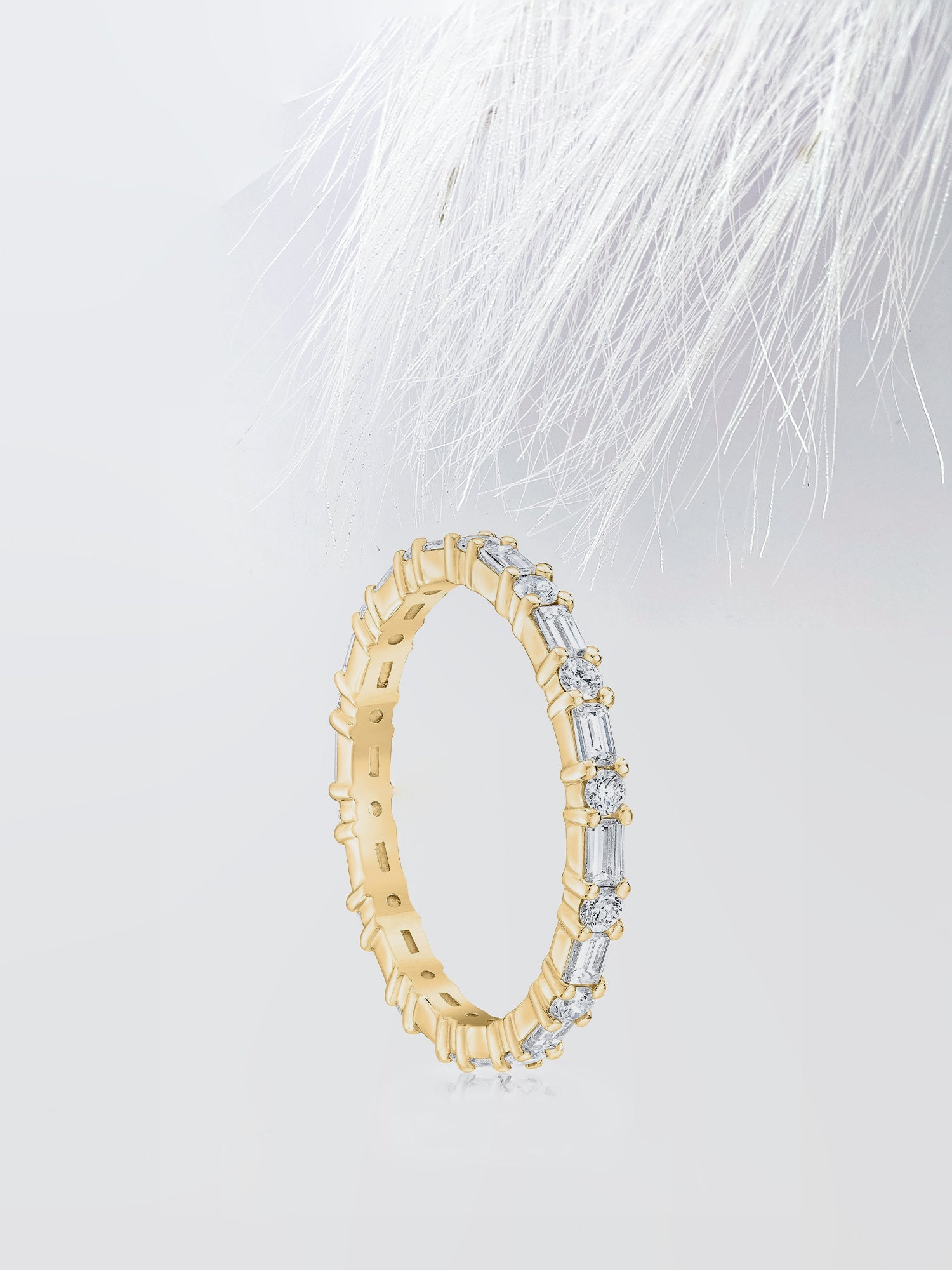 ✦ Celebrate eternal love with our Round & Baguette Cut Eternity Diamond Wedding Band for Women. Meticulously crafted. this band features a continuous row of alternating round and baguette-cut diamonds. symbolizing the enduring bond between you and your partner. Each diamond is expertly set to maximize its brilliance and radiance. creating a stunning display of timeless elegance. Whether worn alone as a statement piece or paired with an engagement ring for added sparkle. this wedding band is a symbol of your everlasting commitment. Whether exchanged on your wedding day or presented as a cherished anniversary gift. it is destined to be treasured for a lifetime. symbolizing the love and devotion that binds you together.