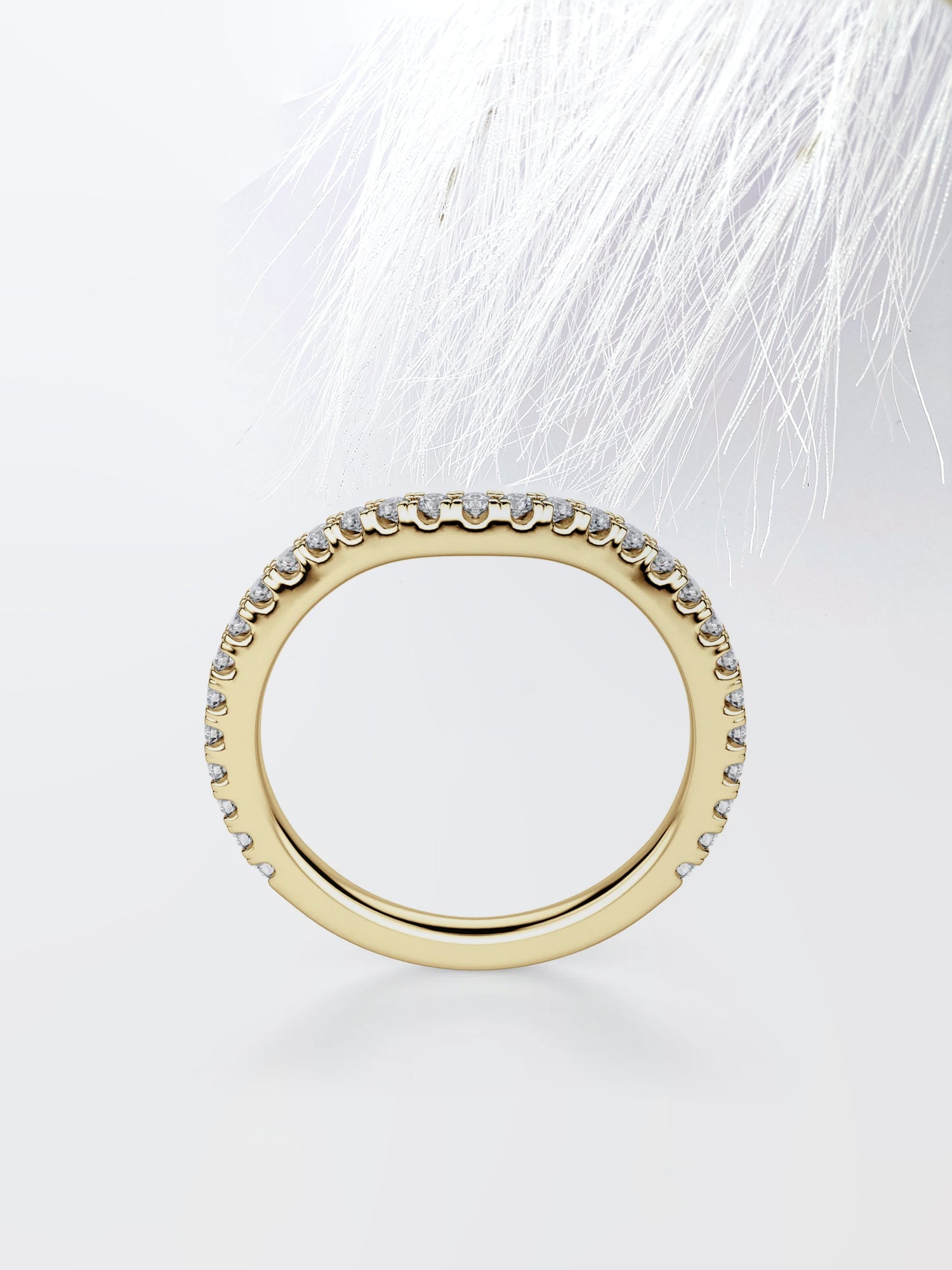 ✦ Adorn her hand with the timeless elegance of our Round Cut Curved Diamond Wedding Band. Crafted with precision and grace. this band features a gentle curve embellished with sparkling round-cut diamonds. each meticulously set to enhance its brilliance. The curved design offers a unique and elegant silhouette. perfectly complementing her engagement ring or adding a touch of sophistication when worn alone. Whether exchanged on your wedding day or as a cherished anniversary token. this wedding band symbolizes the enduring beauty of your love. destined to be treasured for a lifetime.