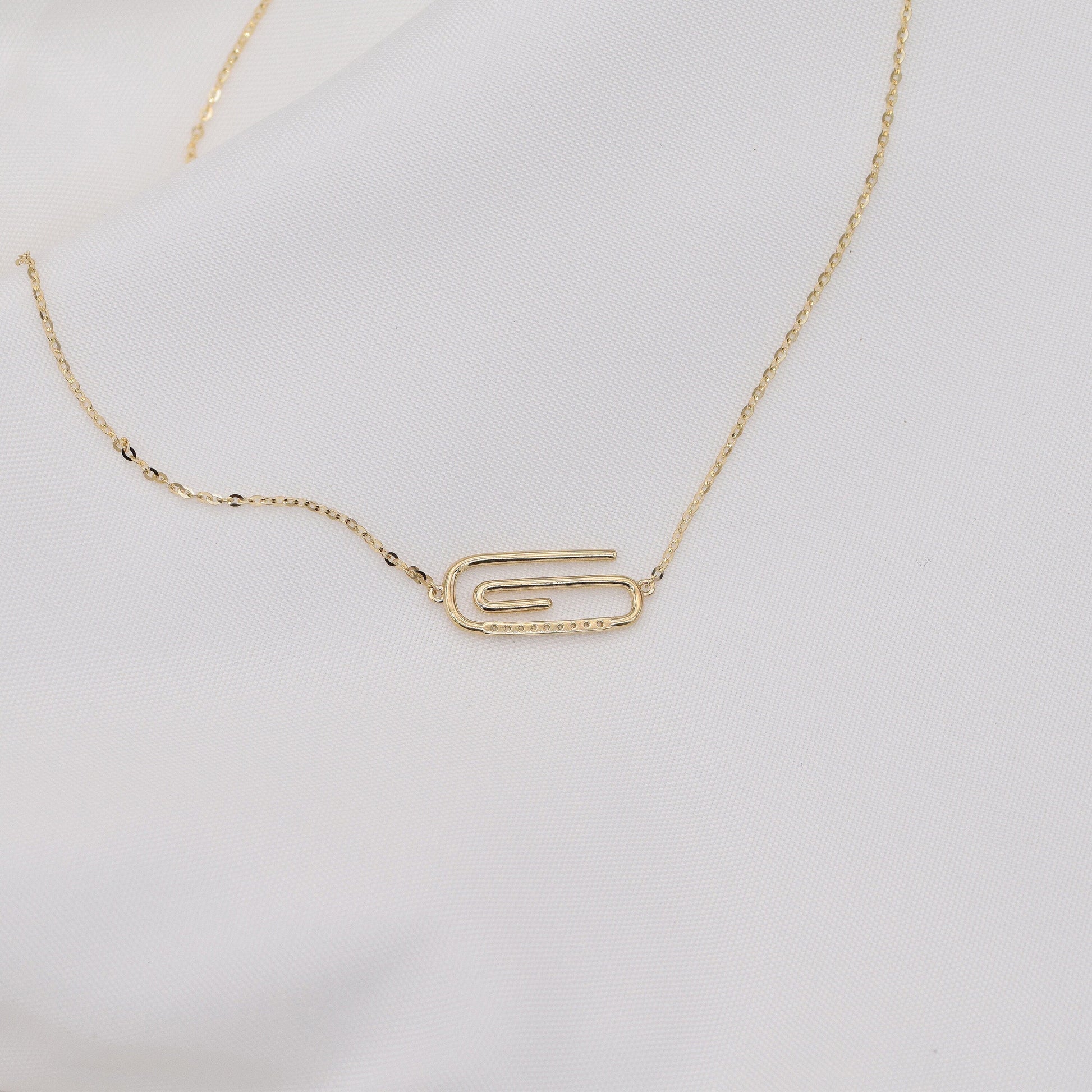 Round Cut Diamond Solid Gold Paper Clip Necklace for Women